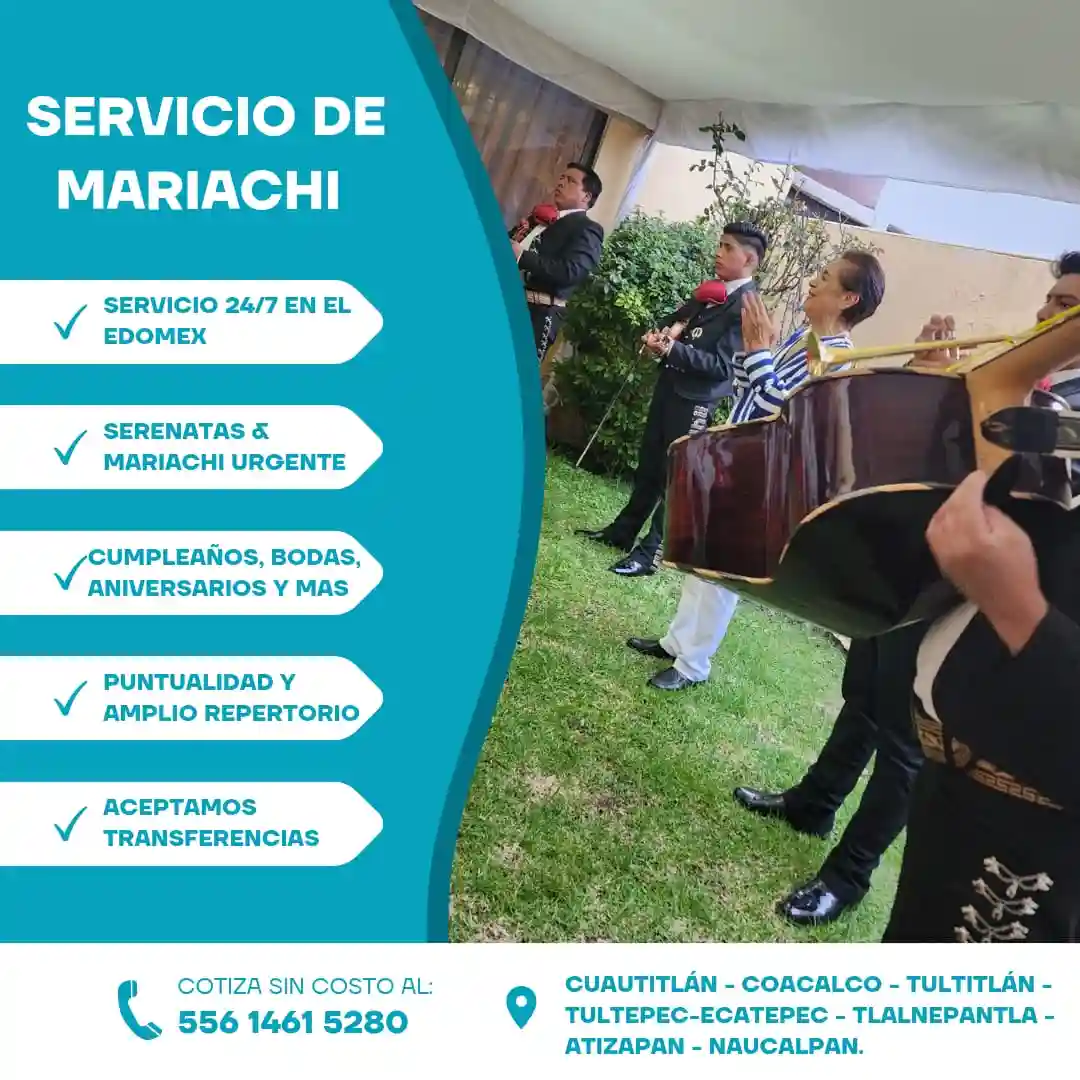 Ofrecemos servicio de mariachi para bodas, cumpleaños, serenatas y mariachi urgente en Cuautitlán, Coacalco , Tultitlan, Tultepec, Cuautitlán Izcalli, Ecatepec, Tecámac , Atizapán , Tlalnepantla, Naucalpan y muchas zonas más.